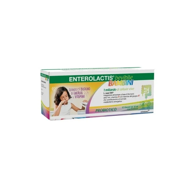 Enterolactis Bevibile Bambini è un prodotto a base di fermenti lattici vivi, con il ceppo L. casei DG, che supporta la flora batterica intestinale dei più piccoli. L'integratore è particolarmente utile nei casi di disturbi intestinali comuni o durante una terapia antibiotica. La combinazione di Vitamine B e D, contribuisce ulteriormente al benessere generale, sostenendo il corretto funzionamento dell'organismo.