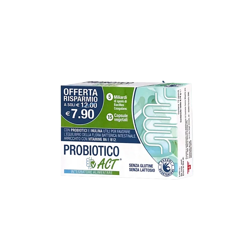 PROBIOTICO ACT è un integratore alimentare a base di 5 miliardi di probiotici (spore di Bacillus coagulans), inulina (prebiotico), vitamina B6 e vitamina B12. Il Bacillus coagulanse l'inulina sono utili per favorire l'equilibrio della flora batterica intestinale. Le vitamine B6 e B12 contribuiscono alla riduzione della stanchezza e dell'affaticamento.