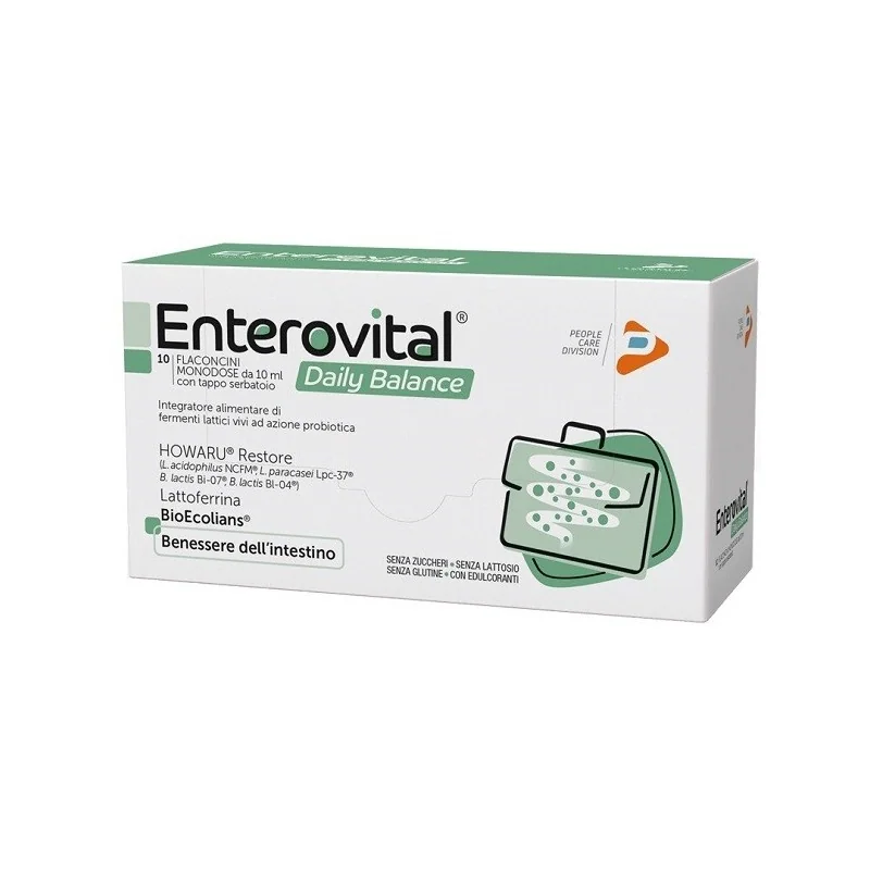Enterovital Daily Balanca è costituito da HOWARU Restore, una miscela di quattro ceppi probiotici [due ceppi di lattobacilli (L. acidophilus NCFM, L. paracasei Lpc-37) e due ceppi di bifidobatteri (B. lactis Bi-07, B. lactis Bl-04)], altamente vitali, in quanto liofilizzati, e attivi nel favorire l'equilibrio della flora intestinale, in sinergia con BioEcolians, fibra prebiotica naturale (GOSa) ben tollerata e a dosaggio ottimizzato, che rappresenta un vero e proprio nutrimento delle comunità batteriche caratteristiche del microbiota di un intestino in salute, favorendo l'equilibrio della flora batterica intestinale. La formula di Enterovital Daily Balance è arricchita, inoltre, con lattoferrina, una glicoproteina multifunzionale, appartenente alla famiglia delle transferrine, responsabile della captazione e del trasporto del ferro e che si trova naturalmente nelle secrezioni come latte, lacrima e saliva. L'intestino funge da barriera tra organismo e ambiente esterno.