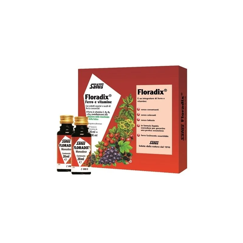 Integratore alimentare di ferro e vitamine B1, vitamina B2, vitamina B6, vitamina B12 e vitamina C; aiuta l'organismo a integrare le riserve di ferro e vitamine.Salus Floradix® è una risposta naturale alle necessità del nostro organismo di integrare il ferro. Per il suo alto valore vitaminico può essere assunto anche in situazioni di stanchezza e mancanza di energia. Grazie alla sua formula a base di estratti d’erbe e succhi di frutta è facile da digerire, non provoca stitichezza e ha un sapore gradevole.