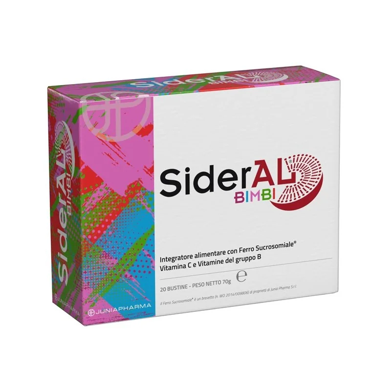 Sideral Bimbi è un integratore alimentare a base di ferro sucrosomiale, vitamina C e vitamine del gruppo B, formulato secondo i dosaggi previsti dai LARN per la fascia di età compresa tra i 4 e i 6 anni, utile per colmare le carenze alimentari o gli aumentati fabbisogni organici di tali nutrienti. Il ferro risulta utile per il corretto sviluppo cognitivo dei bambini. Sideral r.m., ferro pirofosfato sucrosomiale supera indenne l'ambiente gastrico e viene assorbito direttamente a livello intestinale evitando così eventuali fastidi a livello gastrico.