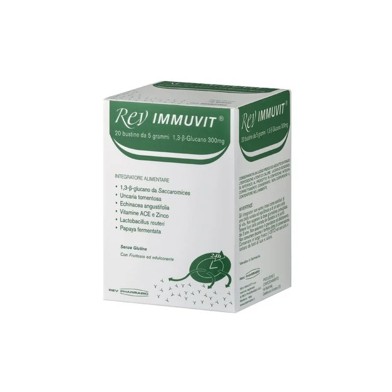 Rev Immuvit è un integratore alimentare in bustine pensato per supportare le difese immunitarie e il benessere dell’organismo nei periodi di maggiore stress, cambio stagione e aumentato rischio di raffreddamenti. Indicato come sostegno quotidiano, utile anche in caso di stanchezza e ridotte energie, con formula pratica da sciogliere in acqua.