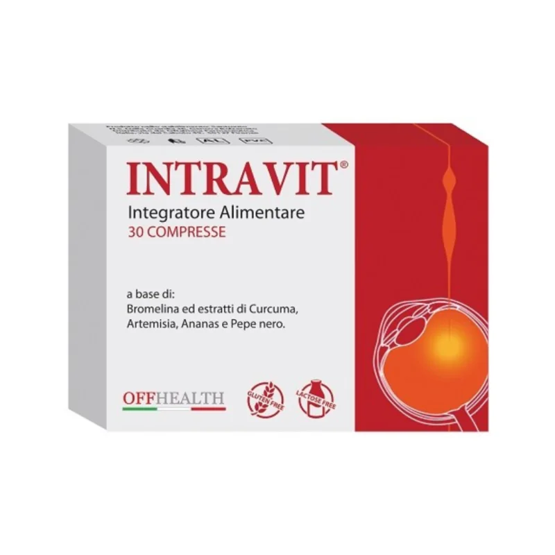 Offhealth Intravit è un integratore alimentare a base di bromelina, curcumina e piperina con estratti di artemisia e ananas. L'ananas favorisce il normale drenaggio dei liquidi corporei (pesantezza delle gambe) e la normale funzionalità del microcircolo, mentre l’artemisia è utile per la sua attività antiossidante.