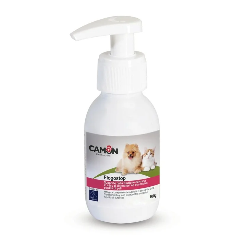 Mangime complementare dietetico per cani e gatti che agisce come supporto alla funzione dermica in caso di dermatosi ed eccessiva perdita di peli, arrossamento, prurito e cattivo odore della cute.