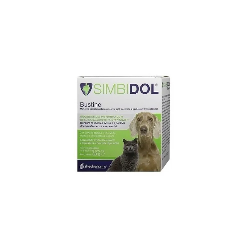 Simbidol è un mangime complementare dietetico formulato per cani e gatti, destinato a specifici fini nutrizionali. Ricco di ingredienti funzionali come farina di carruba, FOS-Fruttoligosaccaridi, lieviti, pectina, MOS-Mannanoligosaccaridi, inulina e altri elementi nutritivi essenziali, Simbidol è progettato per supportare il benessere digestivo e l'equilibrio della flora intestinale dei tuoi animali domestici.