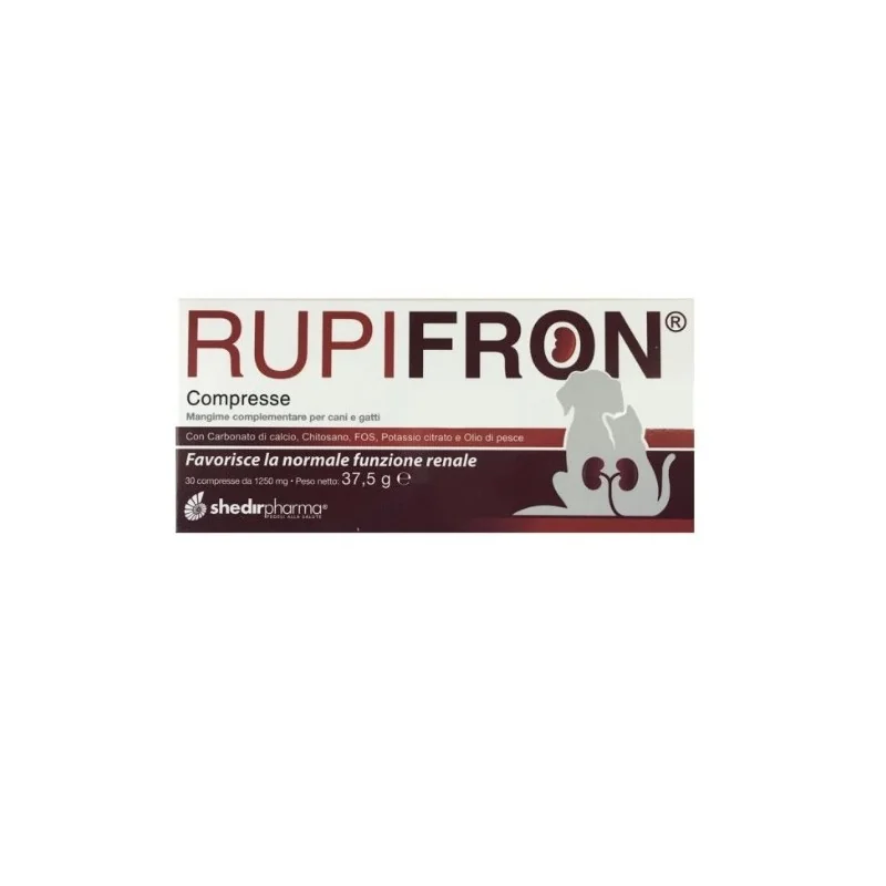 Rupifron è un mangime complementare dedicato ai cani e ai gatti, formulato con un mix bilanciato di ingredienti come Carbonato di calcio, Chitosano, FOS (Fruttoligosaccaridi), Potassio citrato e Olio di pesce, progettato per sostenere la normale funzione renale degli animali, offrendo un aiuto concreto nella gestione dell'equilibrio elettrolitico e nel supporto delle vie urinarie.