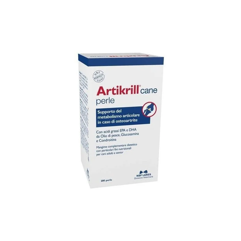 Artikrill cane è un mangime complementare dietetico formulato con acidi grassi omega-3 (EPA) da olio di pesce e con un livello adeguato di vitamina E per il supporto del metabolismo articolare in caso di osteoartrite del cane.