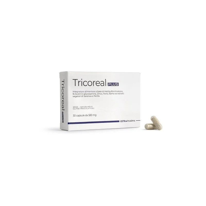 Tricoreal PLUS è un integratore alimentare a base di metilsulfonilmetano, N-acetil D-glucosamina, zinco, ferro, rame ed estratti vegetali di serenoa e perilla, indicato in caso di scarso apporto con la dieta o aumentato fabbisogno di tali nutrienti. Il rame contribuisce alla normale pigmentazione dei capelli, mentre lo zinco contribuisce al mantenimento di capelli e unghie normali. L'N-acetil D-glucosamina interviene nella sintesi dell'acido ialuronico.