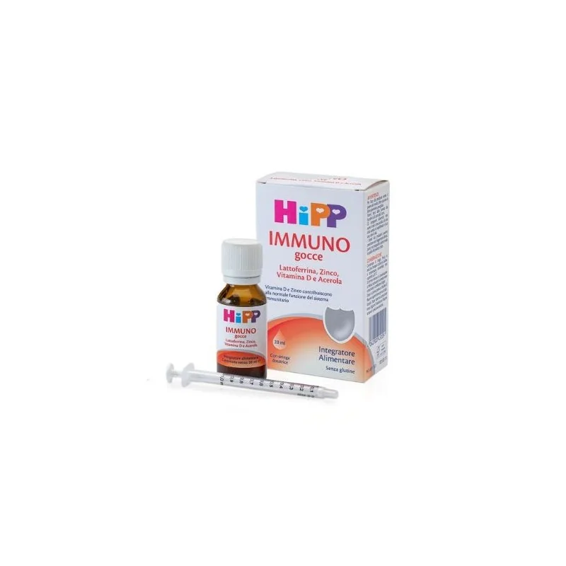 Hipp Immuno Gocce Integratore Difese Immunitarie è un prodotto alimentare a base di lattoferrina, zinco, vitamina D e acerola. Lo zinco contribuisce alla normale funzione del sistema immunitario e alla protezione delle cellule dallo stress ossidativo. La vitamina D è necessaria per la normale crescita e per lo sviluppo osseo nei bambini e contribuisce alla normale funzione del sistema immunitario nei bambini. L'acerola, ad azione di sostegno e ricostituente, è utile per le naturali difese dell'organismo. Senza glutine.