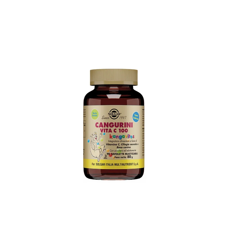 Solgar Cangurini Vita C 100 Gusto Arancia è un integratore alimentare di vitamina C che contribuisce alla normale funzione del sistema immunitario. La ciliegia Acerola sostiene le naturali difese dell'organismo e insieme alla Rosa canina presenta azione di sostegno e ricostituente.
