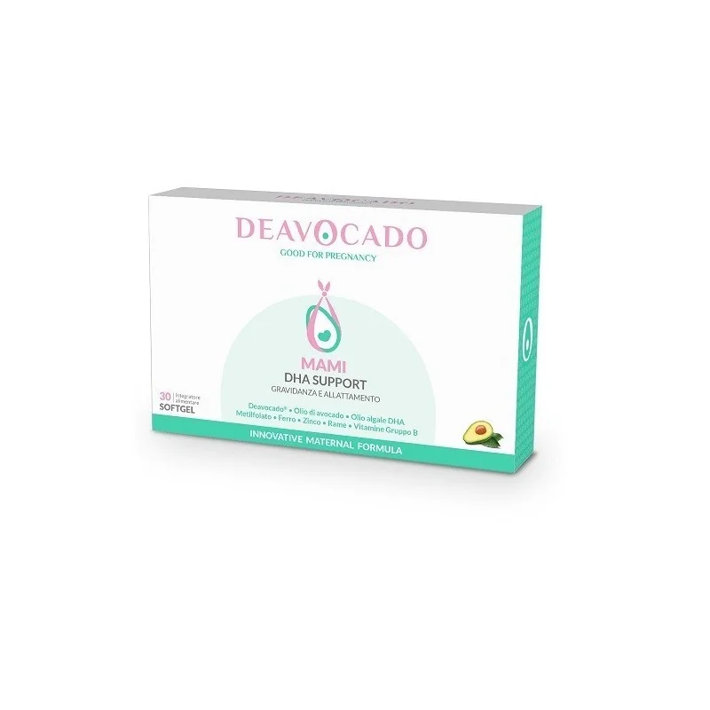 Deavocado mami DHA support Integratore alimentare con micronutrienti, Deavocado, olio di avocado, olio algale DHA, metilfolato, ferro, zinco, rame e vitamine gruppo B.