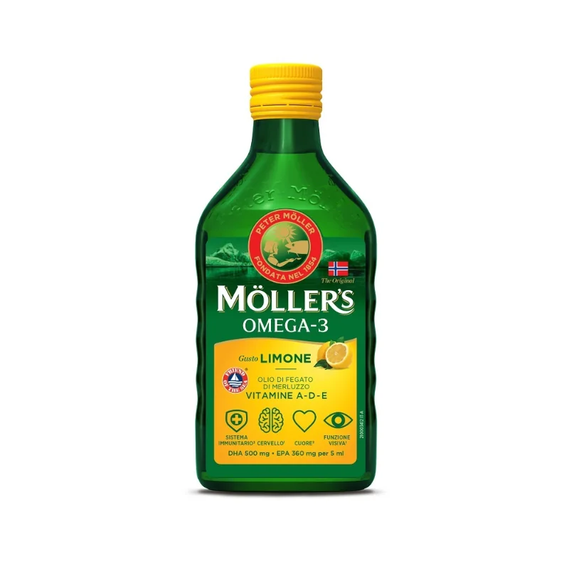 Moller's Omega 3 è un complemento alimentare con una formula a base di olio di fegato di merluzzo, ricco in Omega-3 DHA ed EPA e arricchito con vitamina A,D ed E.