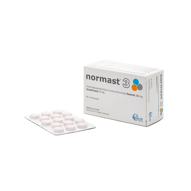 Alimento destinato a fini speciali. La Sindrome Ipocinetica dell'Anziano e la Sindrome Metabolica del Diabetico costituiscono fattori di rischio crescente-spesso tra loro sinergici-per l'insorgenza di una inadeguata modulazione della neuroinfiammazione di basso grado (low-grade neuroinflammation), destinati ad alterare progressivamente l'equilibrio del Sistema Neuro-Immuno Vascolare. Ne conseguono sintomatologie algiche di tipo infiammatorio, turbe del sistema muscolo scheletrico e, soprattutto, alterazioni del sistema nervoso autonomico innervante la parete dei vasi, principalmente arteriosi; alterazioni che esitano in danni funzionali a carico della elasticità del vaso e della integrità della parete interna dello stesso. Il principio attivo Rutamid interviene sia sulla neuroinfiammazione di basso grado- mastocita dipendente- sia sulla reattività elastica del vaso. L'associazione con l'idrossitirosolo, un principio attivo dell'olio di oliva dotato di straordinario potere antiossidante, concorre a determinare un adeguato controllo della componete lipidica circolante. Normast 3 è da utilizzare sotto controllo medico, per il regime alimentare di soggetti con disturbi sostenuti da processi neuroinfiammatori.