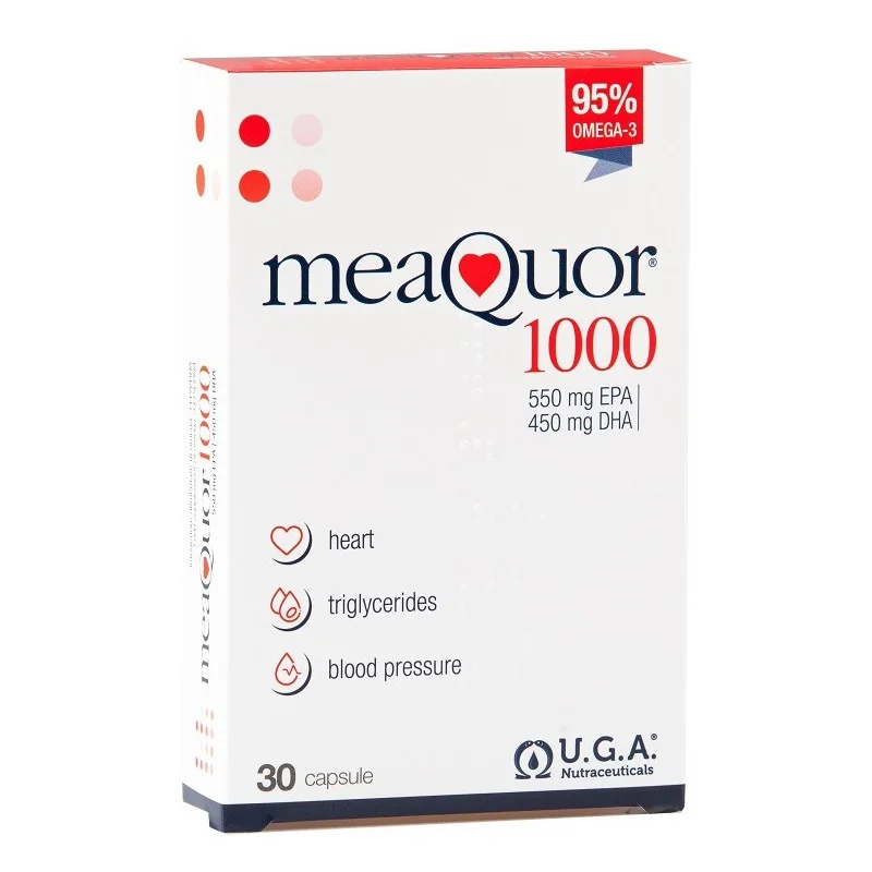- L'assunzione giornaliera di 250 mg di EPA+DHA contribuisce al mantenimento di una normale funzione cardiaca (1 capsula di Meaquor 1000).