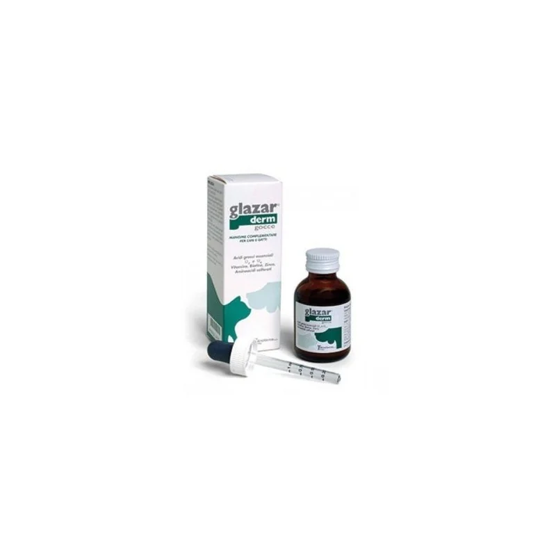 Teknofarma Glazarderm Gocce Premiscela per Cani e Gatti è un prodotto formulato per compensare carenze alimentari (vitaminiche, minerali, di aminoacidi essenziali solforati e soprattutto di acidi grassi essenziali Omega-3 e Omega 6) che si manifestano con la comparsa di problemi cutanei (seborrea, forfora, pelle secca, alopecie carenziali, pelo opaco e caduco, reazioni infiammatorie eccessive, problemi cutanei su base allergica).