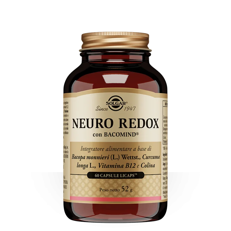 Solgar Neuro Redox Integratore Sistema Nervoso è un prodotto alimentare a base di bacopa [Bacopa monnieri (L.) Wettst.], curcuma (Curcuma longa L.), vitamina B12 e colina. La vitamina B12 contribuisce al normale funzionamento del sistema nervoso, alla normale funzione psicologica e, insieme alla colina, contribuisce al normale metabolismo dell’omocisteina. La bacopa favorisce la memoria e le funzioni cognitive.