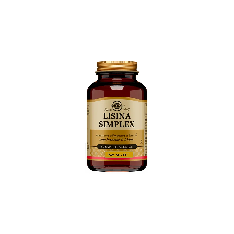Solgar Lisina Simplex Integratore di Lisina è un prodotto alimentare a base di amminoacido L-Lisina, amminoacido essenziale che necessita di esser introdotto con dieta o integratori. Indicato in caso di ridotto apporto con la dieta o aumentato fabbisogno. Si tratta di un elemento che agisce in sinergia alla vitamina C diventando un costituente del collagene.