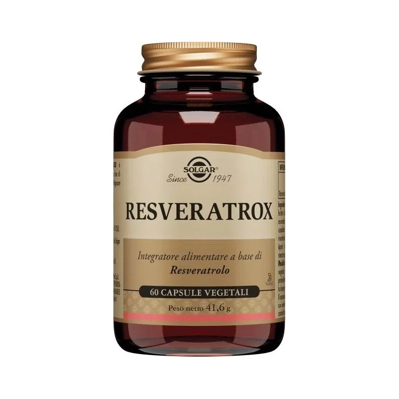 Solgar Resveratrox Integratore Antiossidante è un integratore alimentare a base di resveratrolo (da radici di Polygonum cuspidatum Siebold & Zucc.). Il resveratrolo è un ingrediente dall'azione antiossidante che protegge le cellule dallo stress ossidativo.
