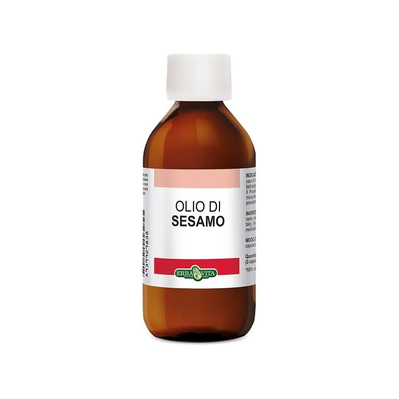 Olio di sesamo ottenuto tramite spremitura a freddo, utile in caso di ridotto apporto con la dieta o aumentato fabbisogno.