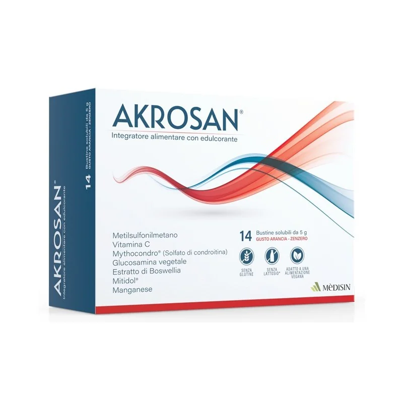 Integratore alimentare a base di metilsulfonilmetano (MSM), Mythocondro (solfato di condroitina di origine non animale), glucosamina vegetale, estratto di Boswellia titolato al 10% in AKBA, Mitidol, vitamina C e manganese.