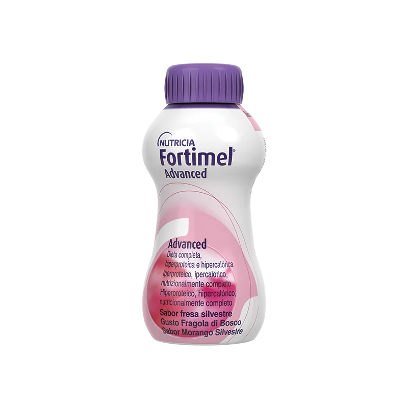 Supplemento nutrizionale orale completo, iperproteico (21 g di proteine per bottiglietta), ipercalorico (300 kcal per bottiglietta) a base di sieroproteine, con 3 g di leucina e un’alta concentrazione di aminoacidi essenziali. Fortimel Advanced è fonte di vitamina D e calcio. La presenza di macronutrienti e fibre prebiotiche lo rendono particolarmente indicato per il recupero massa muscolare, del peso corporeo, della performance fisica.