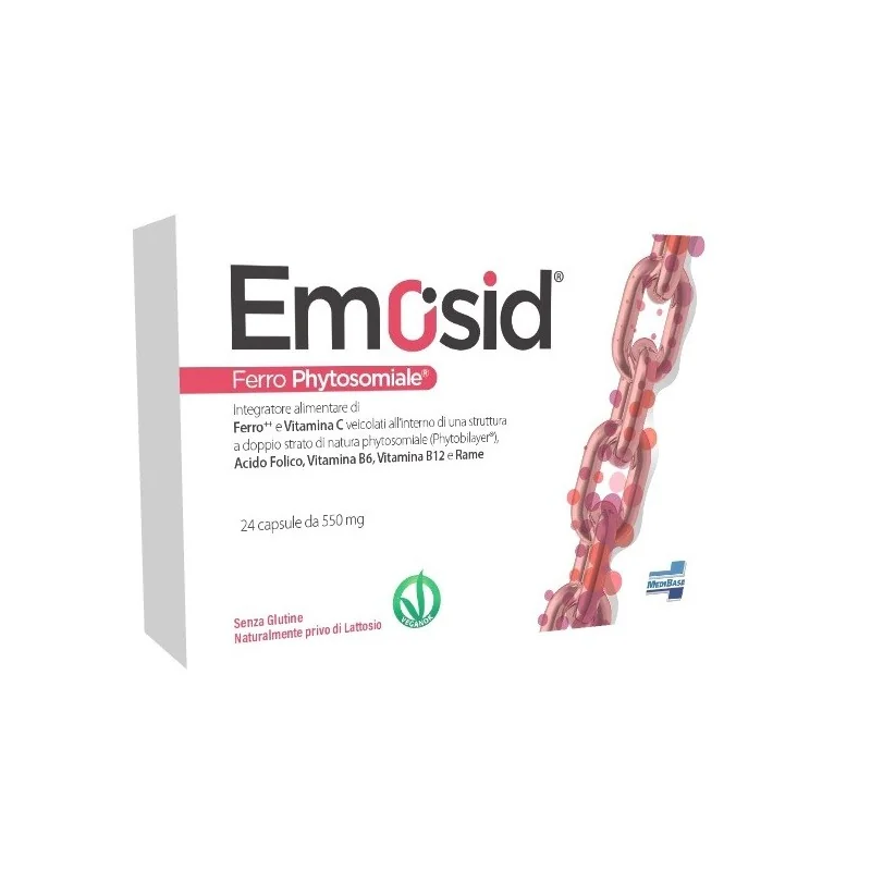 Integratore alimentare a base di ferro Phytosomiale (ferro++ e vitamina C veicolati all’interno di una struttura a doppio strato di natura Phytosomiale: tecnologia Phytobilayer). L'uso del ferro Phytosomiale permette di eliminare completamente i disturbi normalmente correlati all'uso del ferro orale. La biodisponibilità del Fe++ presente in Emosid è particolarmente elevata ed è attribuibile all’utilizzo di un'innovativa forma di Phytosoma attivo a doppio strato, ottenuto attraverso la particolare e brevettata tecnologia Phytobilayer. Il ferro Phytosomiale supera indenne la barriera gastrica e viene assorbito a livello intestinale. Il ferro Fe++ contribuisce alla formazione di globuli rossi ed emoglobina, alla funzionalità del sistema immunitario, al normale trasporto di ossigeno nell’organismo e riduce stanchezza ed affaticamento. Il rame e la vitamina C contribuiscono al normale trasporto e assorbimento del ferro orale nell’organismo. L’acido folico contribuisce alla normale emopoiesi.