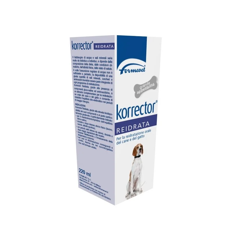 Formevet Korrector Reidrata Integratore Reidratante è un alimento complementare per cane e gatto. Il prodotto è utile per il mantenimento/ripristino dell'equilibrio idrico-salino; durante e dopo intenso sforzo fisico (lavoro, caccia, attività sportiva); nei periodi caldi (stress da calore), durante o dopo viaggi, esposizioni alle mostre; durante l'allattamento o l'innalzamento della temperatura corporea; nei casi di disidratazione conseguenti a vomito, diarrea sia nel cucciolo/gattino che nell'animale adulto.