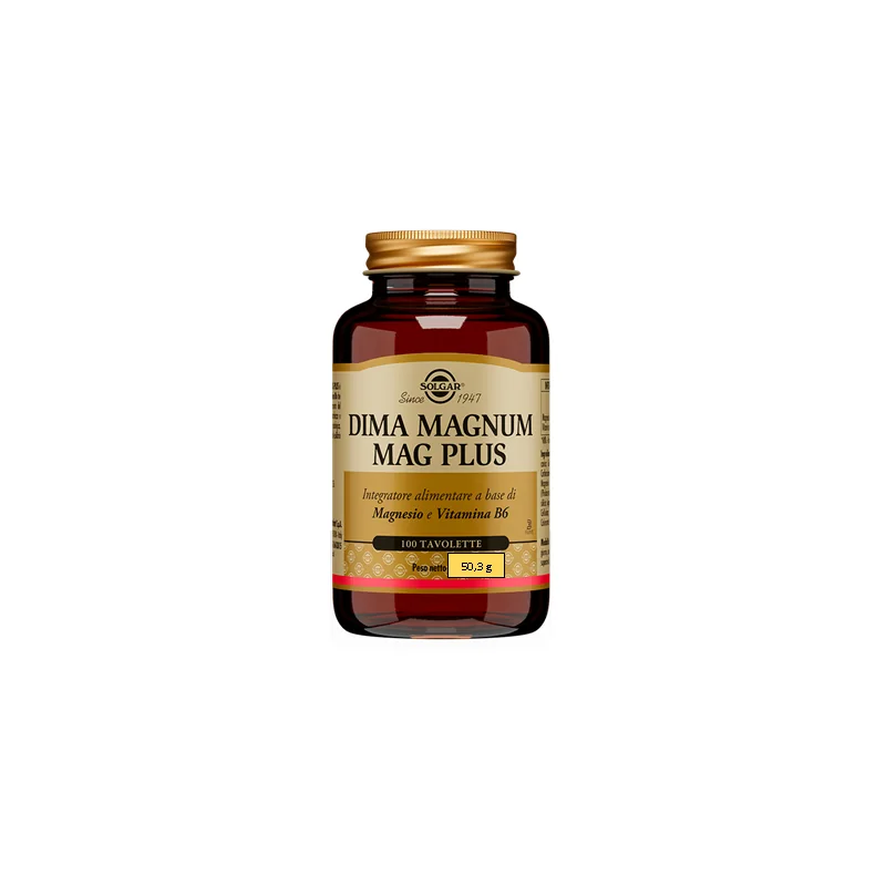 Solgar Dima Magnum Mag Plus Integratore di Magnesio è un prodotto alimentare a base di magnesio ossido in associazione a vitamina B6, nutrienti che contribuiscono alla normale funzione del sistema nervoso, alla normale funzione psicologica e alla riduzione della stanchezza e dell'affaticamento. La vitamina B6 contribuisce alla regolazione dell'attività ormonale. Il magnesio contribuisce al normale equilibrio elettrolitico richiama liquidi a livello intestinale facilitandone l'eliminazione.