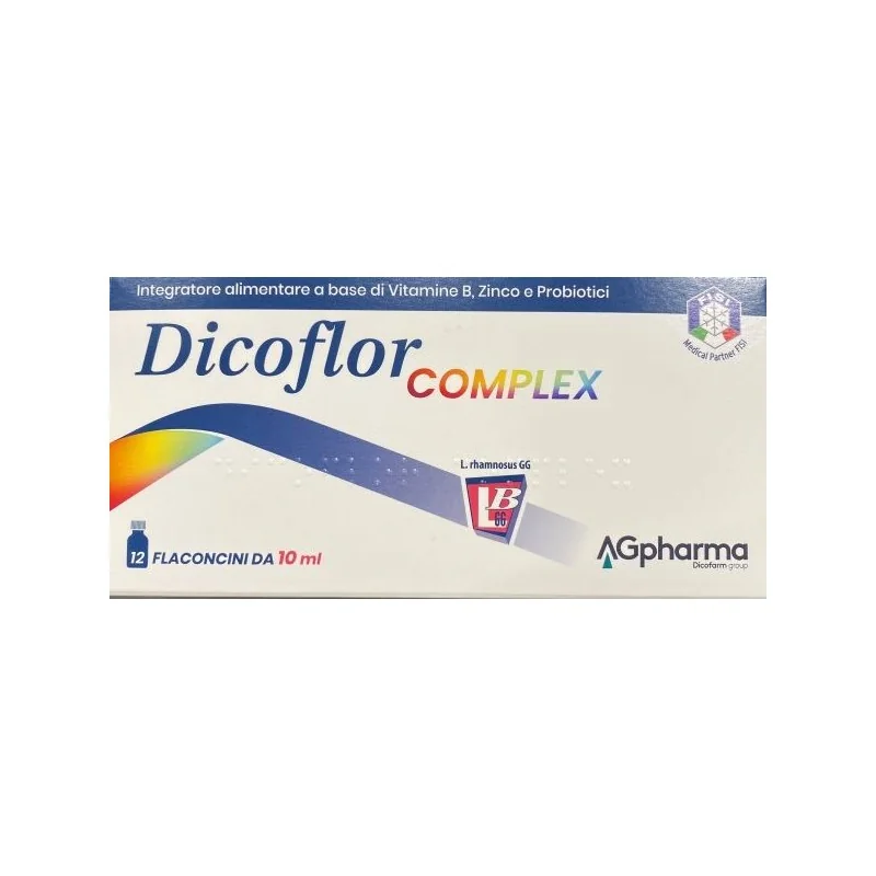 Dicoflor Complex è un integratore a base di Vitamine del gruppo B, Zinco e Probiotici. Nello specifico: