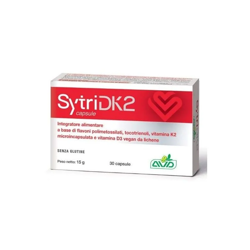 SytriDK2 Integratore per le Ossa è un integratore alimentare di flavoni polimetossilati estratti da agrumi (Citrus nobilis), tocotrienoli da palma (Elaeis guineensis), vitamina K2 (Menachinone-7), microincapsulata liposolubile ad elevata biodisponibilità e vitamina D3 vegana ottenuta da Lichene islandico (Cladonia rangiferina). La vitamina D3 contribuisce al normale assorbimento e utilizzo del calcio e del fosforo. La vitamina K2 contribuisce a mantenere il normale stato di salute delle ossa. Senza glutine.
