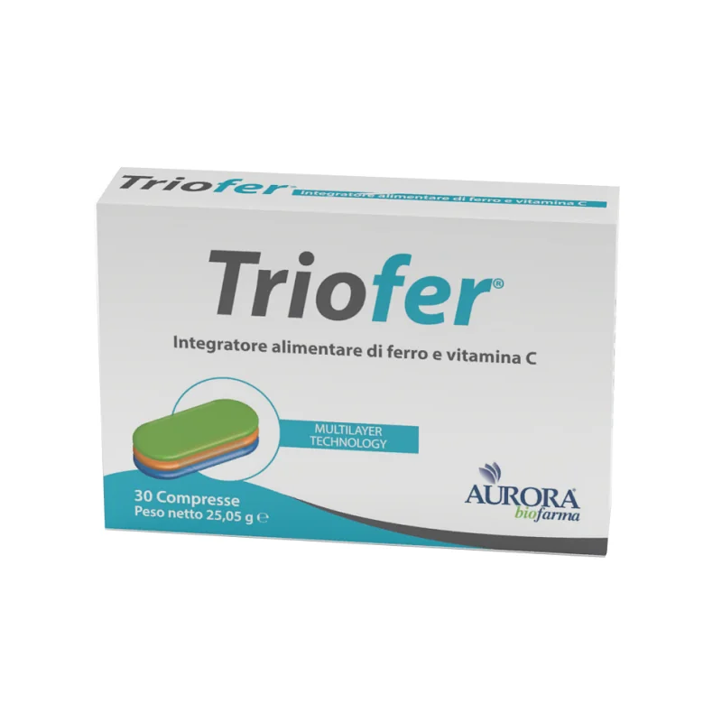 Triofer Integratore di Ferro è un prodotto a base di ferro (30 mg per 1 compressa) e vitamina C (70 mg). Il ferro contribuisce alla normale formazione dei globuli rossi e dell'emoglobina e al corretto trasporto di ossigeno nell'organismo. La vitamina C ne aumenta l'assorbimento e contribuisce alla protezione delle cellule dallo stress ossidativo. Inoltre, la loro combinazione favorisce il naturale funzionamento del sistema immunitario e del sistema nervoso e la riduzione della stanchezza e affaticamento. È utile in caso di carenza di ferro, durante gravidanza e allattamento e in caso di perdite ematiche consistenti e prolungate durante il ciclo mestruale. Senza glutine e senza lattosio.