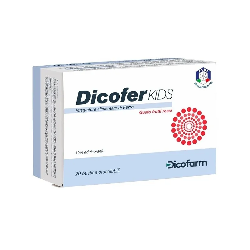 Dicofer Kids è un complemento alimentare a base di Ferro microincapsulato gastroprotetto formulato per l'assunzione da parte dei bambini. Dicofer è consigliato nei casi in cui tramite la dieta non si riesce a mantenere adeguati i livelli di ferro nel sangue o nel caso in cui vi sia un fabbisogno aumentato. Il ferro è un minerale fondamentale nella formazione dell'emoglobina e dei globuli rossi. Il ferro contribuisce al funzionamento delle attività cognitive e delle difese immunitarie.
