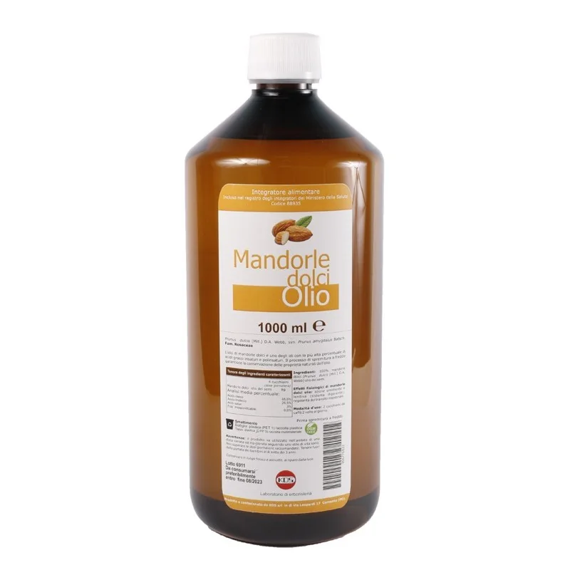 Olio di mandorle dolci [Prunus dulcis (Mill.) D.A. Webb, syn. Prunus amygdalus Batsch.] della Fam. Rosaceae. L'olio di mandorle dolci è uno degli oli con la più alta percentuale di acidi grassi insaturi e polinsaturi. Il processo di spremitura a freddo garantisce la conservazione delle proprietà naturali dell'olio. Ha azione emolliente e lenitiva (sistema digerente) e favorisce la regolarità del transito intestinale.