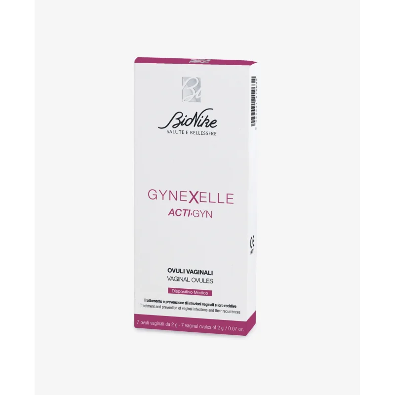Dispositivo medico, in forma di ovuli vaginali, indicato come coadiuvante nella profilassi, nel trattamento e nella prevenzione di infezioni vaginali e loro recidive quali vaginiti, vaginosi batteriche o infezioni micotiche e in caso di alterazioni dell’ambiente vaginale dovute a trattamenti antibiotici prolungati o squilibri ormonali. GYNEXELLE ACTI>GYN favorisce il ripristino dell’ecosistema vaginale, aiuta a prevenire e contrastare la secchezza vaginale, nonché i sintomi di stati irritativi quali prurito, rossore, bruciore, edema e dolore.
