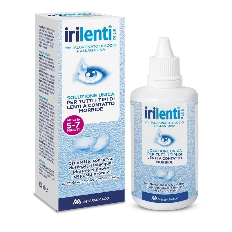 Irilenti Plus Soluzione Unica per Lenti a Contatto è una soluzione unica con ialuronato di sodio e allantoina per la disinfezione, la conservazione, la detersione, il risciacquo, l’idratazione di tutte le lenti a contatto morbide. Rimuove le proteine, speciale per occhi sensibili. Con allantoina, in sinergia con l’acido ialuronico fornisce idratazione alla cornea e compensa le irritazioni. Irilenti Plus idrata le lenti sia appena applicate che durante l'indosso giornaliero con conseguente comfort duraturo e riduzione di secchezza ed irritazione. Attiva in 5-7 minuti.