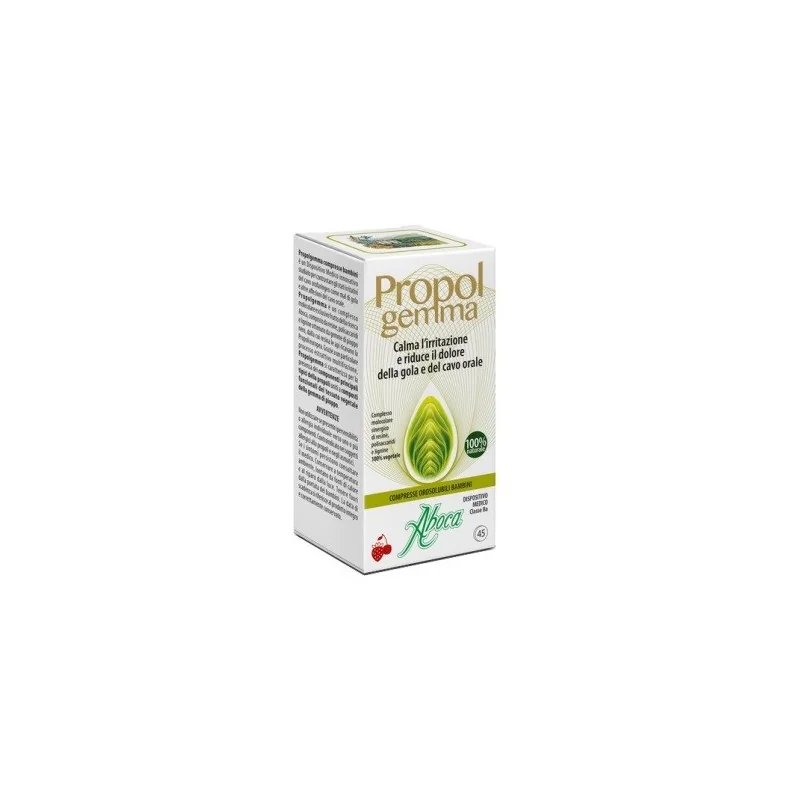 Aboca Propolgemma è un dispositivo medico per bambini a base di propoli che calma l'irritazione e riduce il dolore della gola e del cavo orale. Senza glutine.