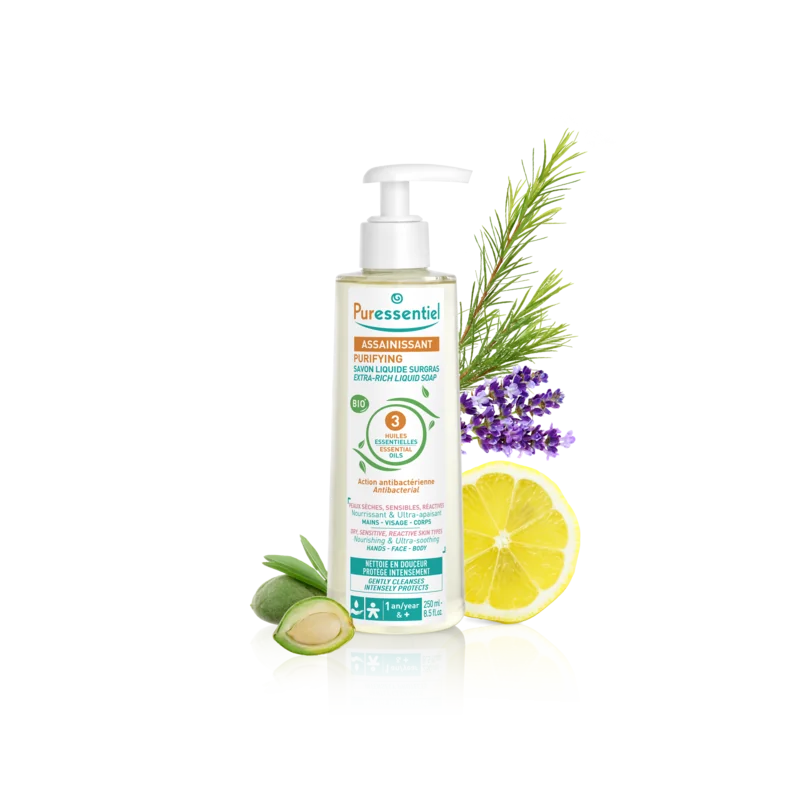 Il Sapone Surgras Liquido Puressentiel deterge delicatamente e protegge intensamente la pelle da impurità e germi. Da utilizzare quotidianamente sul viso e sul corpo, e per lavare frequentemente le mani. Ripristina il film idrolipidico e lenisce le sensazioni di tensione della pelle. È adatto alle pelli secche e sensibili, grazie al suo effetto nutriente e ultra-lenitivo. Questo sapone lascia la pelle sana e delicatamente profumata e rispetta l'equilibrio fisiologico della pelle. Formula al 98,4% di origine naturale con oli essenziali biologici di limone, lavanda e tea tree.