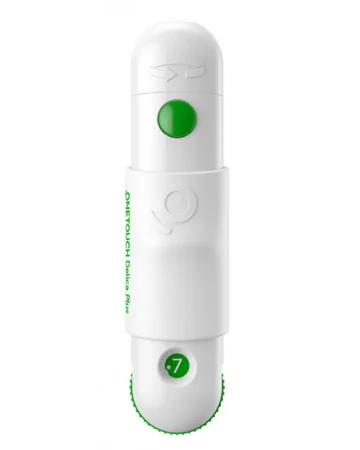 Il dispositivo pungidito OneTouch Delica Plus fornisce un modo facile e sicuro per ottenere una goccia di sangue capillare dal polpastrello. Il dispositivo dispone di 13 impostazioni di profondità per il comfort personale: ogni puntino mostrato tra i numeri 1 e 7 sulla rotella di regolazione profondità indica che c'è un'altra impostazione di profondità disponibile. Il dispositivo OneTouch Delica Plus è dotato di una funzione di espulsione della lancetta che garantisce una facile e sicura rimozione della lancetta usata. Inoltre, il dispositivo è dotato di un meccanismo di controllo delle vibrazioni posizionato nel cappuccio. Il dispositivo OneTouch Delica Plus utilizza le lancette OneTouch Delica e OneTouch Delica Plus.