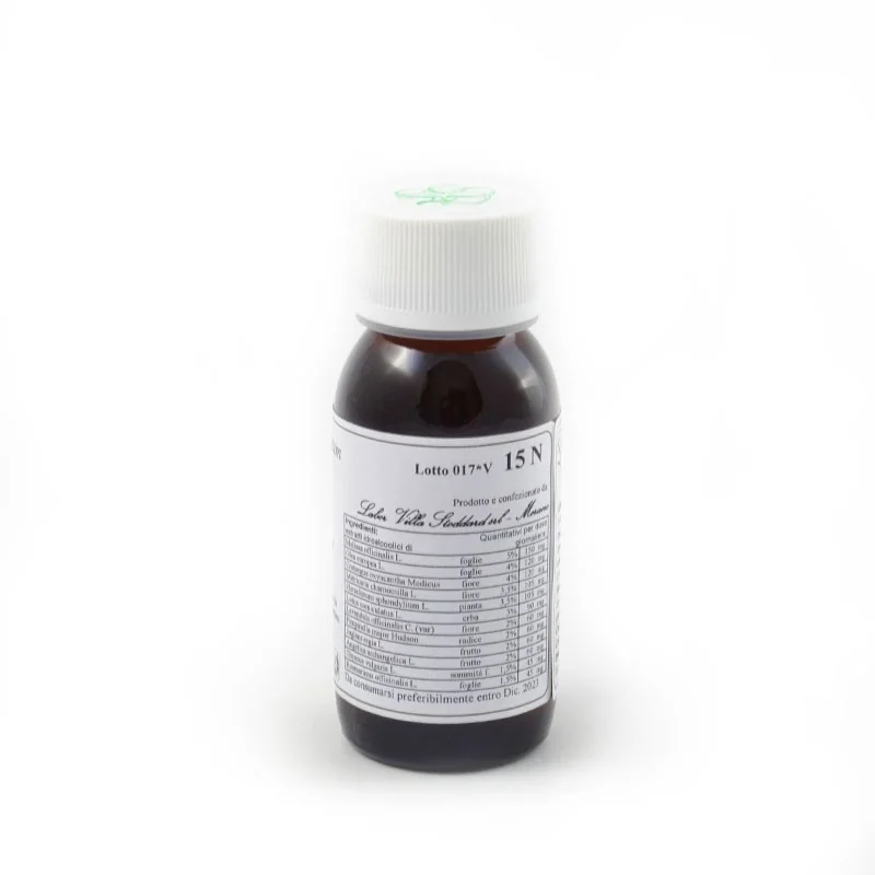 Alcool etilico da grano* tenero (69%); estratti idroalcolici di: Melissa officinalis L. foglie, Olea europea L. foglie, Crataegus oxyacantha auct. fiore, Matricaria chamomilla L. fiore, Passiflora incarnata L. erba, Valeriana officinalis L. radice, Lavandula officinalis C. (var) fiore, Scrophularia ningpoensis Hel. radice, Salvia officinalis L. erba, Artemisia abrotanum L. erba, Ulmus pumila L corteccia, Rosmarinus officinalis L. foglie.