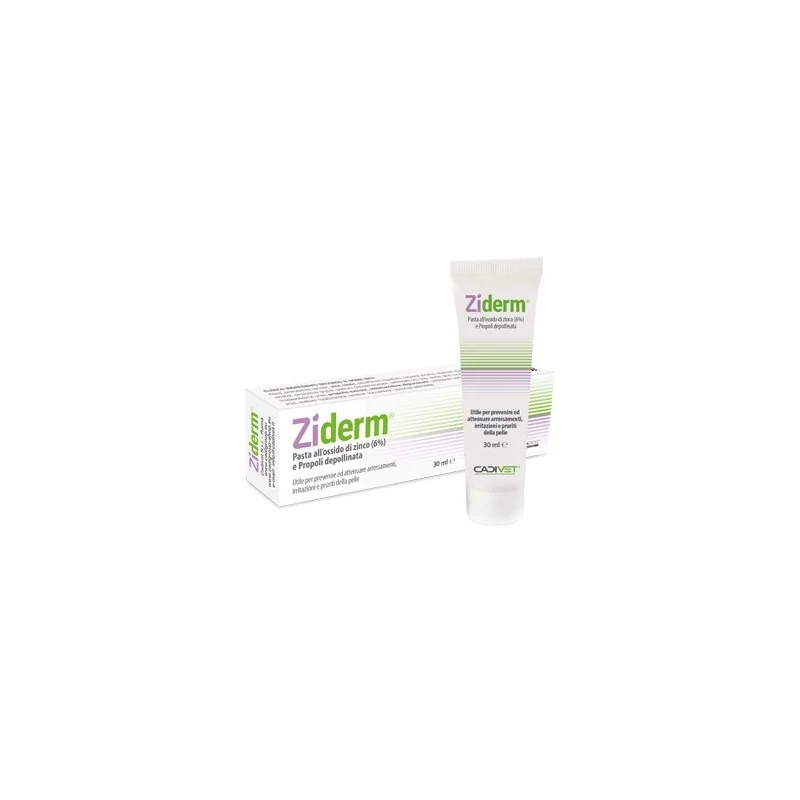 Pasta all'ossido di zinco (6%) arricchita con propoli depollinata, acido undecilenico e acido ialuronico. È utile per prevenire e attenuare arrossamenti, infiammazioni, e pruriti dell'epidermide causati anche da infezioni microbiche e micotiche. Ziderm è un cosmetico indicato anche nel campo veterinario su cani , gatti e altri animali.