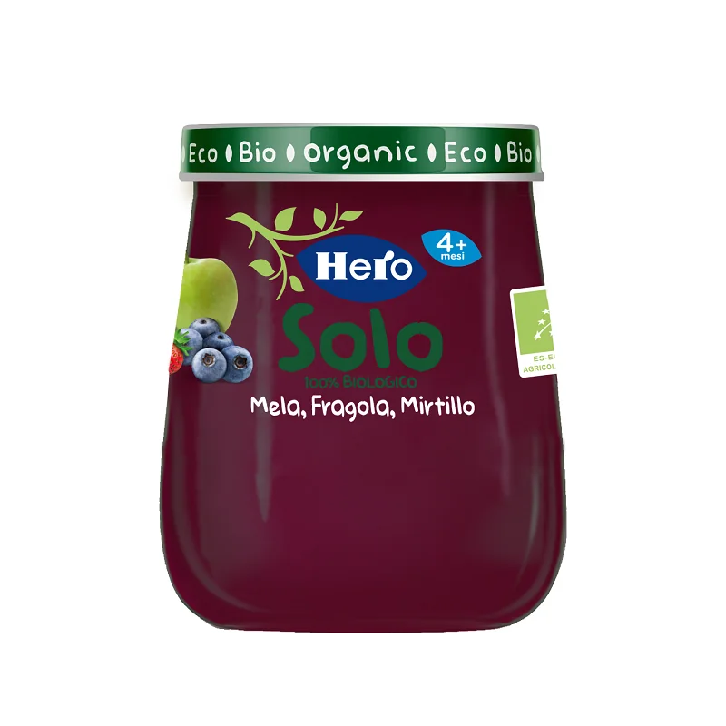 Alimento per l'infanzia biologico a base di mela, fragola e mirtillo. A partire dai 6 mesi.