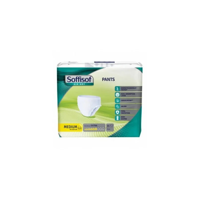 Soffisof Air Dry Pants Extra è una mutandina assorbente monouso ideale per pazienti deambulanti, autosufficienti e attivi, con perdite medie. Facile da indossare come la normale biancheria intima. Discreta, confortevole e silenziosa.