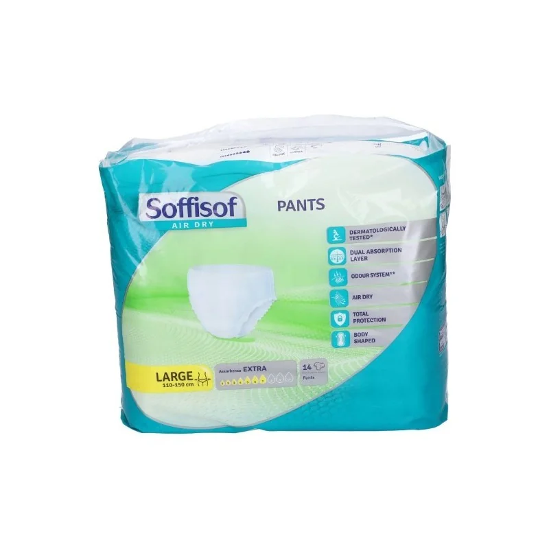 Soffisof Air Dry Pants Extra è una mutandina assorbente monouso ideale per pazienti deambulanti, autosufficienti e attivi, con perdite medie. Facile da indossare come la normale biancheria intima. Discreta, confortevole e silenziosa.