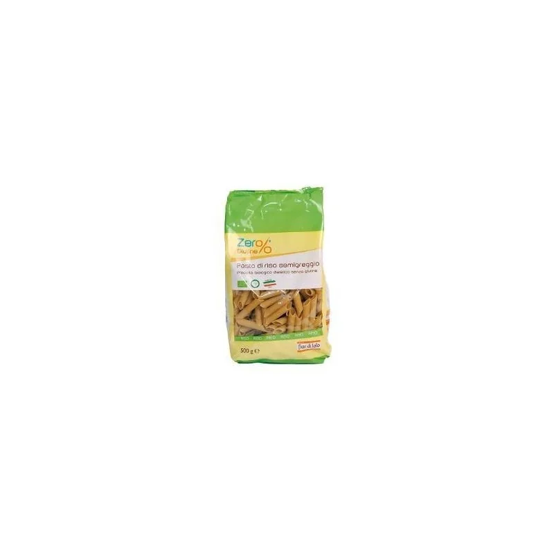 Pasta di riso semigreggio, formato penne senza glutine da agricoltura biologica.Il riso semigreggio è il riso comunemente chiamato integrale, ovvero liberato dalla lolla, il rivestimento più esterno del chicco non commestibile.