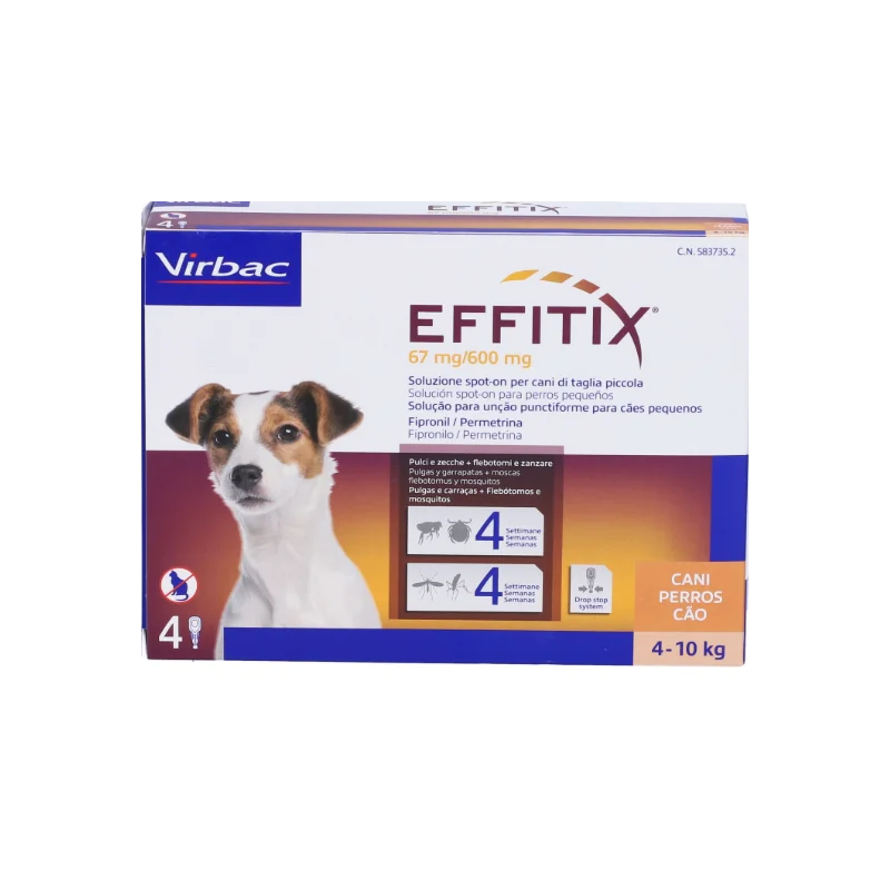 Virbac Effitix 67 Mg/600 Mg Soluzione Spot-on per Cani 4-10Kg è un farmaco veterinario pensato per contrastare e prevenire le infestazioni di pulci e zecche dal proprio cane. Il dosaggio è da applicare a cani di piccola taglia. Il prodotto appartiene alla categoria degli ectoparassiticidi per uso topico.