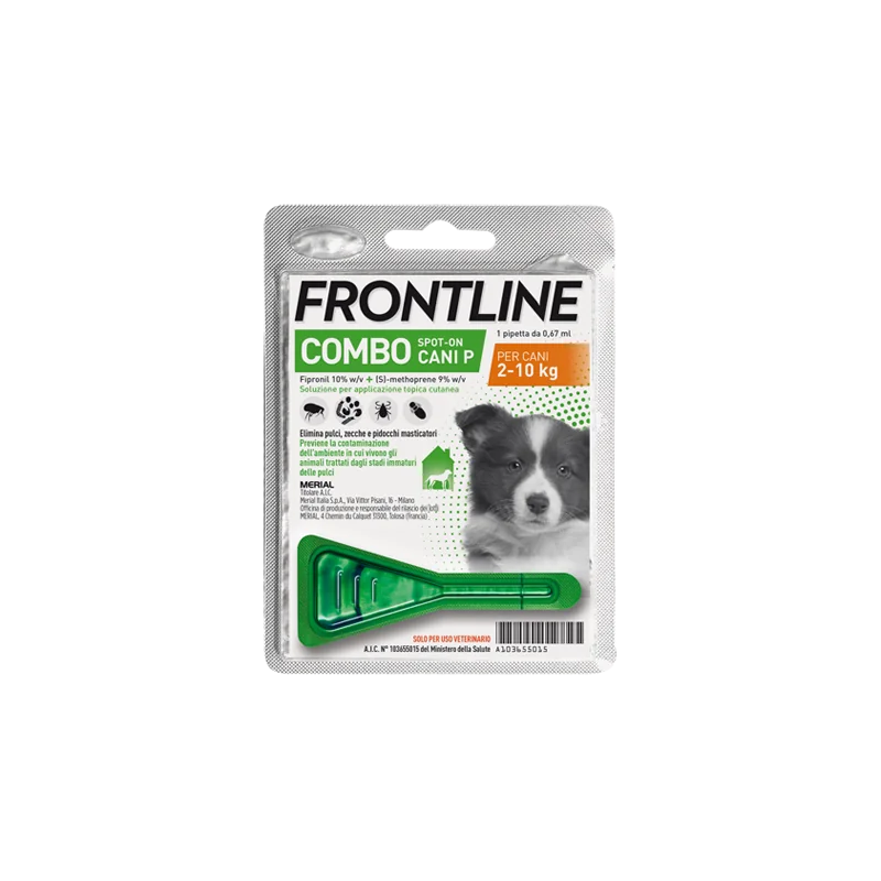 Per il trattamento dei cani di peso compreso tra i 2 e i 10 kg: da utilizzare nei confronti delle infestazioni da pulci, zecche e pidocchi masticatori. Trattamento delle infestazioni da pulci (Ctenocephalides spp.). L'attività insetticida nei confronti di nuove infestazioni da pulci adulte persiste per 8 settimane. Previene la moltiplicazione delle pulci inibendo lo sviluppo delle uova (attività ovicida), delle pupe e delle larve (attivita' larvicida) nate dalle uova deposte dalle pulci adulte, per 8 settimane dopo l'applicazione. Trattamento delle infestazioni da zecche (Ixodes ricinus, Dermacentor variabilis, Dermacentor reticulatus, Rhipicephalus sanguineus). Il prodotto ha un'attività nei confronti delle zecche persistente fino a 4 settimane. Trattamento delle infestazioni da pidocchi masticatori (Trichodectes canis). FRONTLINE COMBO SPOT-ON CANI P può essere utilizzato nel programma per il controllo della Dermatite Allergica da Pulce (DAP).
