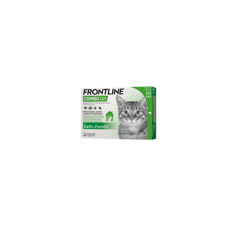 Nei gatti: da utilizzare nei confronti delle infestazioni da pulci, da sole o associate a zecche e pidocchi masticatori. Elimina le pulci (Ctenocephalides spp.). L'attivita' insetticida nei confronti di nuove infestazioni da pulci adulte persiste per 4 settimane. Previene la moltiplicazione delle pulci inibendo lo sviluppo delle uova (attivita' ovicida), delle pupe e delle larve (attivita' larvicida) nate dalle uova deposte dalle pulci adulte, per 6 settimane dopo l'applicazione. Elimina le zecche (Ixodes ricinus, Dermacentor variabilis, Rhipicephalus sanguineus). Il prodotto ha un'attivita' nei confronti delle zecche persistente fino a 2 settimane (in base a dati sperimentali). Elimina i pidocchi masticatori (Felicola subrostratus). Frontline Combo Spot-on Gatti puo' essere utilizzato nel programma per il controllo della Dermatite Allergica da Pulce (DAP). Nei furetti: da utilizzare nei confronti delle infestazioni da pulci, da sole o associate a zecche. Elimina le pulci (Ctenocephalides spp.). L'attivita' insetticida nei confronti di nuove infestazioni da pulci adulte persiste per 4 settimane. Previene la moltiplicazione delle pulci inibendo lo sviluppo delle uova (attività ovicida), delle pupe e delle larve (attivita' larvicida) nate dalle uova deposte dalle pulci adulte. Elimina le zecche (Ixodes ricinus). Il prodotto ha un'attivita' acaricida nei confronti delle zecche persistente per 4 settimane (in base a dati sperimentali).