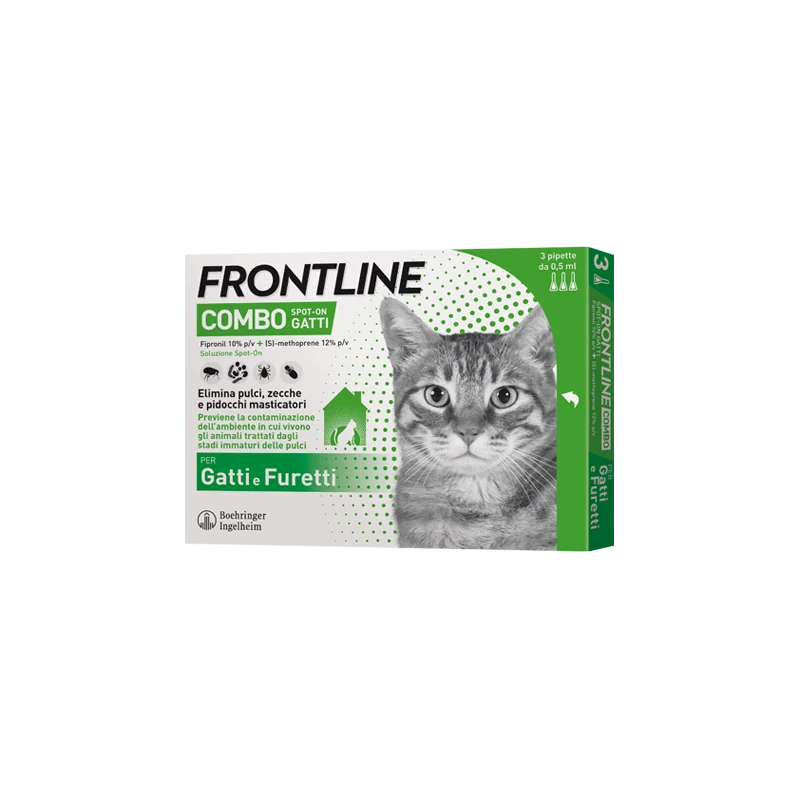 Nei gatti: da utilizzare nei confronti delle infestazioni da pulci, da sole o associate a zecche e pidocchi masticatori. Elimina le pulci (Ctenocephalides spp.). L'attivita' insetticida nei confronti di nuove infestazioni da pulci adulte persiste per 4 settimane. Previene la moltiplicazione delle pulci inibendo lo sviluppo delle uova (attivita' ovicida), delle pupe e delle larve (attivita' larvicida) nate dalle uova deposte dalle pulci adulte, per 6 settimane dopo l'applicazione. Elimina le zecche (Ixodes ricinus, Dermacentor variabilis, Rhipicephalus sanguineus). Il prodotto ha un'attivita' nei confronti delle zecche persistente fino a 2 settimane (in base a dati sperimentali). Elimina i pidocchi masticatori (Felicola subrostratus). Frontline Combo Spot-on Gatti puo' essere utilizzato nel programma per il controllo della Dermatite Allergica da Pulce (DAP). Nei furetti: da utilizzare nei confronti delle infestazioni da pulci, da sole o associate a zecche. Elimina le pulci (Ctenocephalides spp.). L'attivita' insetticida nei confronti di nuove infestazioni da pulci adulte persiste per 4 settimane. Previene la moltiplicazione delle pulci inibendo lo sviluppo delle uova (attività ovicida), delle pupe e delle larve (attivita' larvicida) nate dalle uova deposte dalle pulci adulte. Elimina le zecche (Ixodes ricinus). Il prodotto ha un'attivita' acaricida nei confronti delle zecche persistente per 4 settimane (in base a dati sperimentali).
