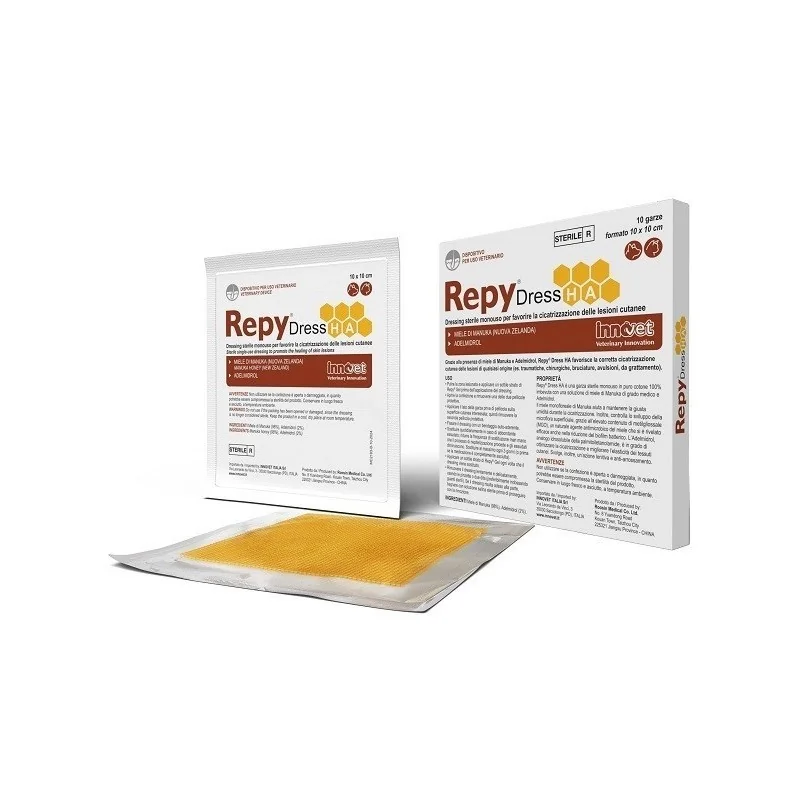 Repy Dress HA è una garza sterile monouso in puro cotone 100% imbevuta con una soluzione di miele di manuka di grado medico e adelmidrol.