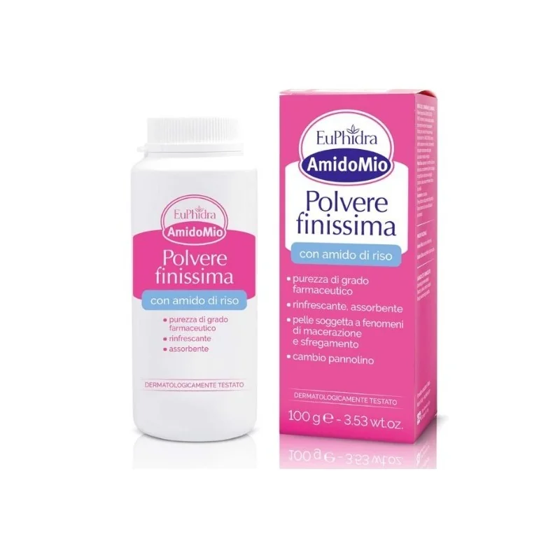 Euphidra AmidoMio Polvere Finissima Dopo Bagnetto è un prodotto in polvere che lenisce gli arrossamenti, previene le irritazioni e mantiene la pelle asciutta e morbida, senza ostacolare la normale traspirazione cutanea da utilizzare al momento del cambio pannolino. Indicata per i bambini fin dai primi mesi, le particelle fini di amido di riso creano un film assorbente e lenitivo, che permette la naturale traspirazione della pelle, lasciandola morbida e levigata.